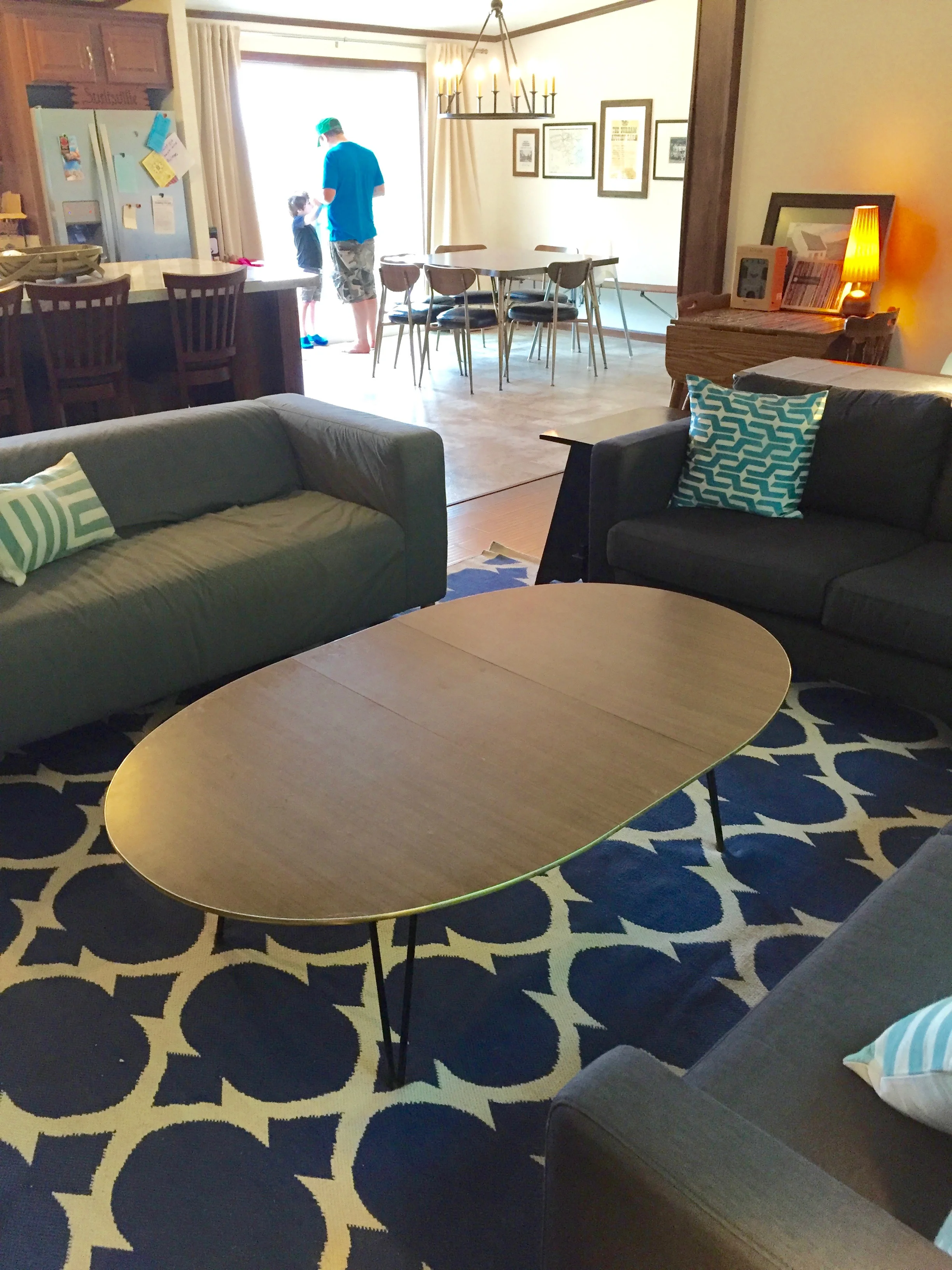 Our double-wide sleeps 20 (plus room for a few more on the sofa), so we need a ton of living room seating for waking hours. We added the IKEA Klippan loveseat (only $249) to complete the U-shaped seating space. We also added a narrow table behind the couch with 3 more chairs -- perfect for extra TV-viewing seats or extra dining space.