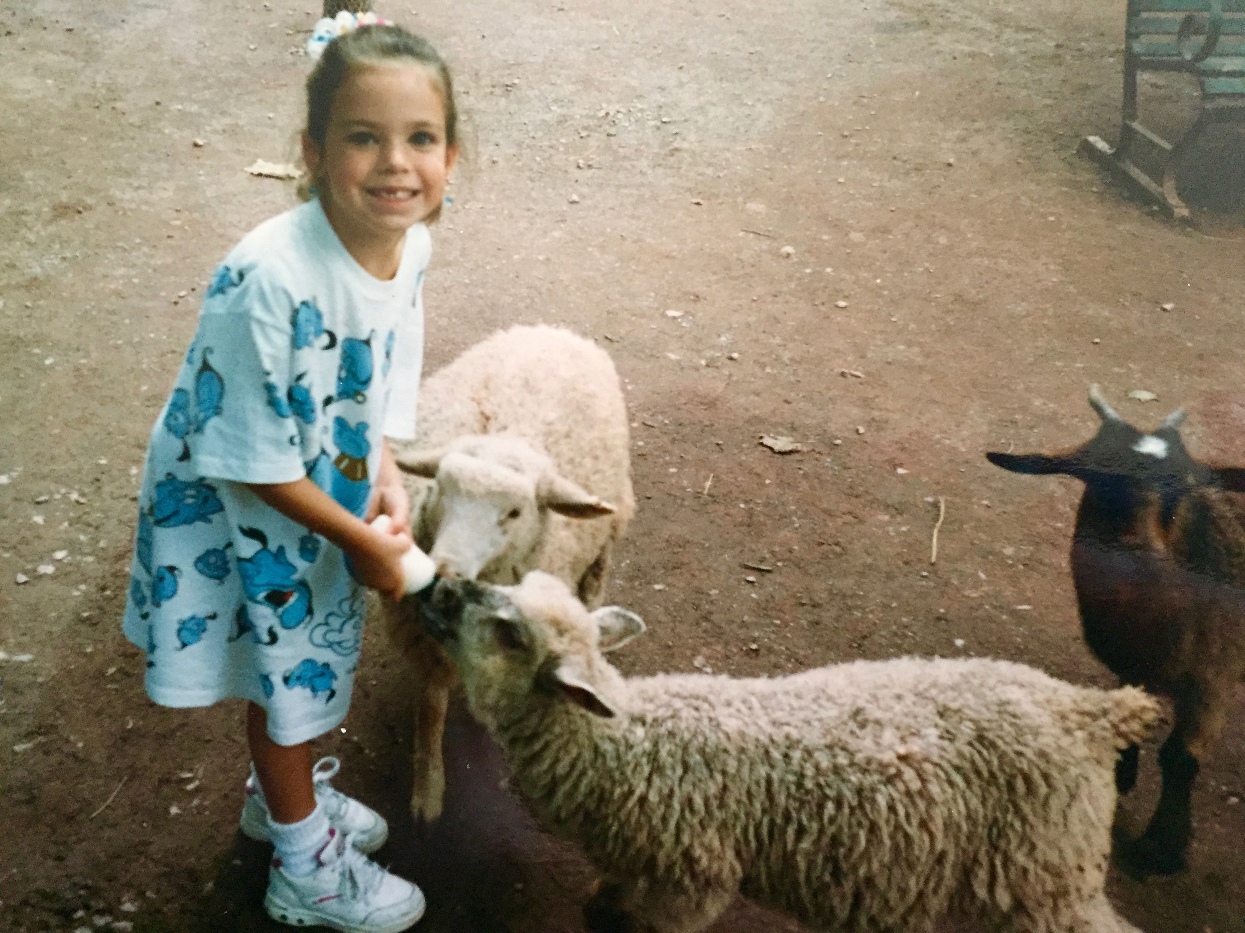 Here's my cousin, Kian, dealing with some more docile sheep. Perhaps they were floored by her spot-on style. Knee-length Aladdin Genie t-shirt and oversized scrunchie? Yes, please.