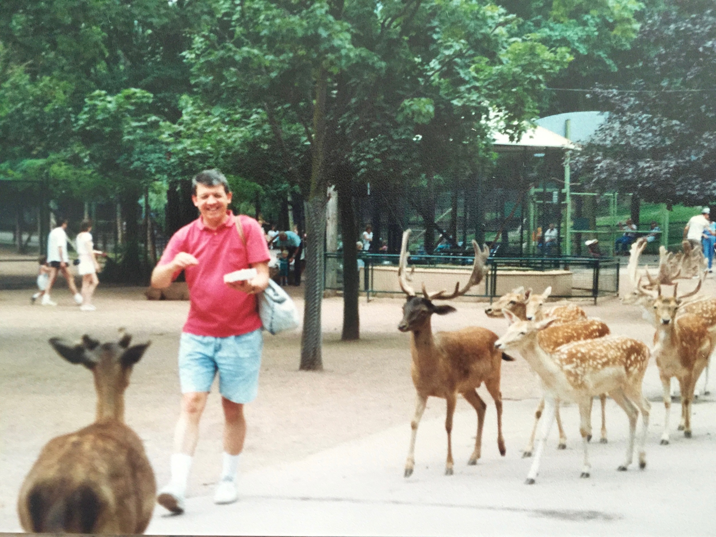 Here's my Uncle Tommy, flashing a nervous smile as a antlered herd gets a whiff of his crackers. Kind of reminds me of the herds of children at Carson City back in the day.