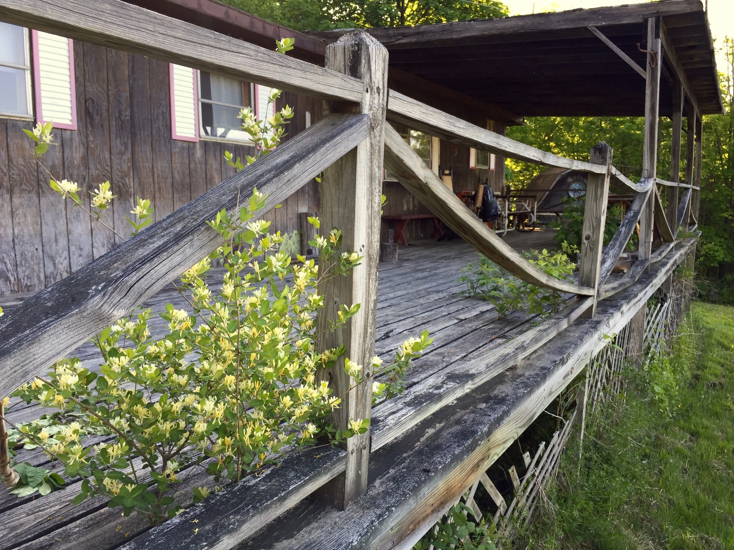 This was my grandfather's beloved weekend home. I took these photos the last time I saw it. It was a 1972 single-wide trailer, purchased in 1979, the year I was born. My grandfather extended it into a double-wide and built a deck the length of the place. He affixed plywood bunk beds into the wood-paneled walls of each narrow bedroom. He decorated with antiques won from the local Auction Barn. He bought furniture from local farmers who'd set out their old things on their driveways and sell them on the cheap.