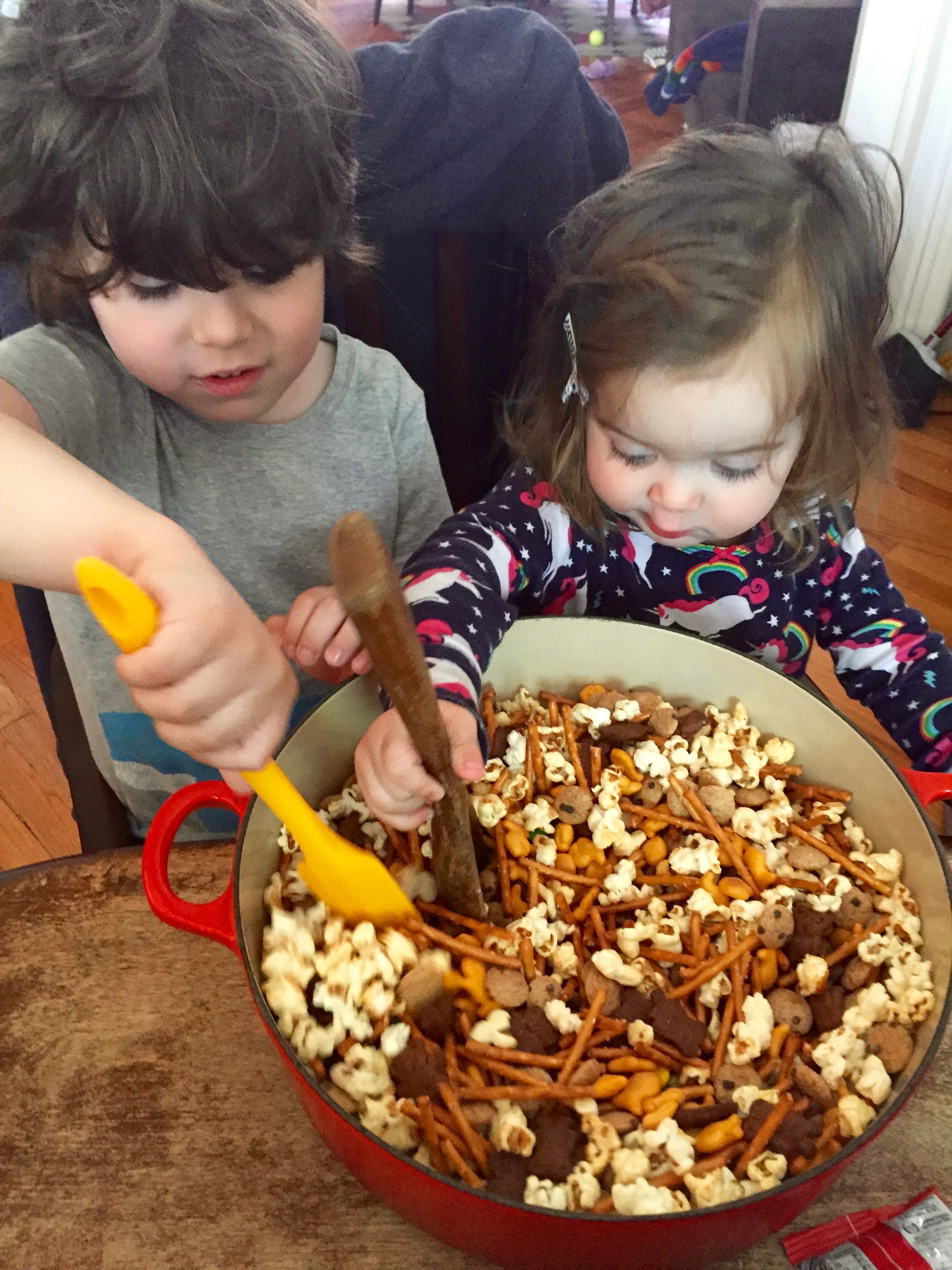 The recipe requires no cooking or specific measurements and can be assembled by a 1-year-old. Our little Ramona worked in tandem with our 5-year old, Archer, which was cute for a minute but then led to a wooden spoon battle. (The battle is not pictured because I had to drop my camera to save the trail mix.)
