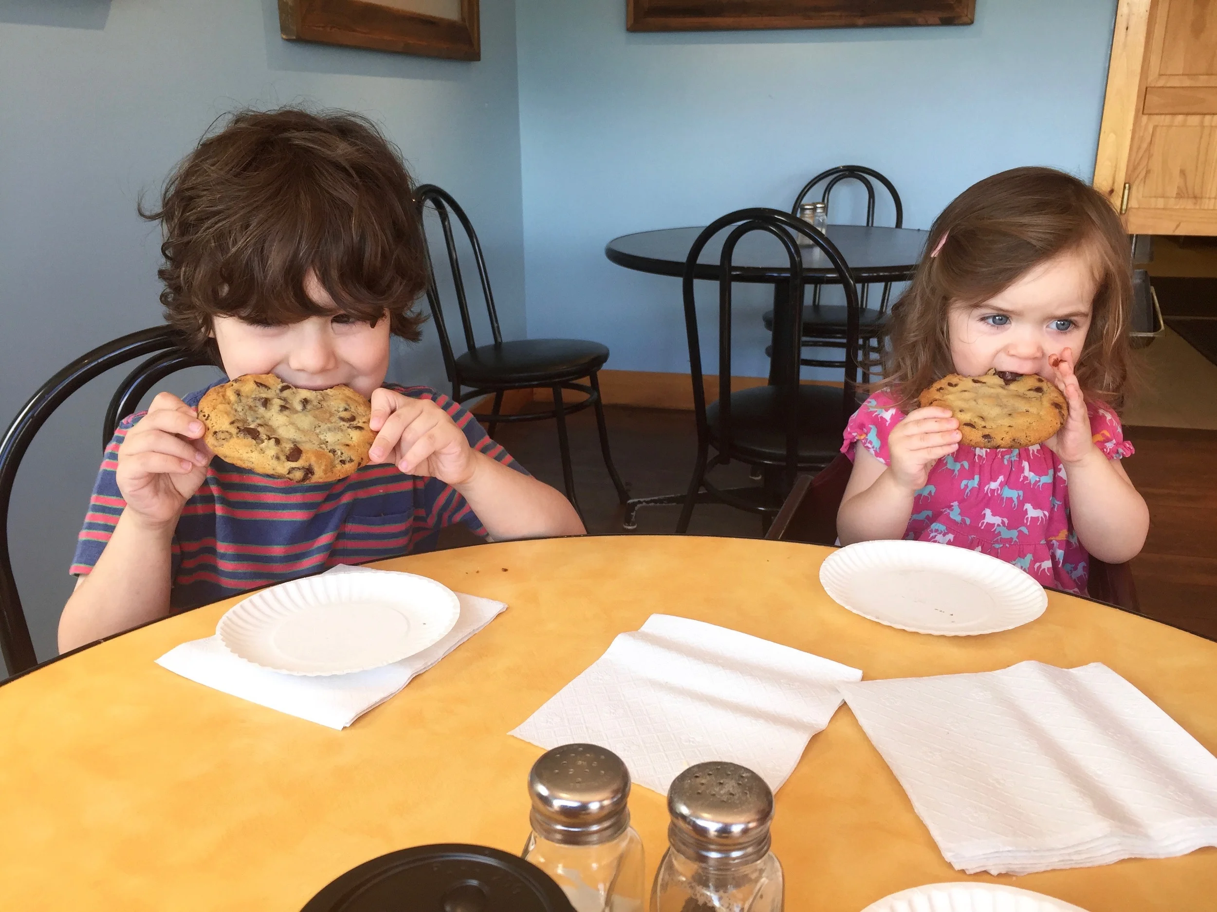 Higher Grounds, a homey coffee shop in Windham, was recommended to me as a good place to bring my laptop. They've got WiFi and plenty of seating, plus some serious sweets. The crumb cake, pictured above, is heaped with crumbs and rich with buttery-sweet deliciousness. Archer, who'd become hooked on scones at the Irish Tea Shop, chose a big blueberry one. But as soon as Ramona shared a bite of her chocolate chip cookie, it was clear that she'd made the better choice.