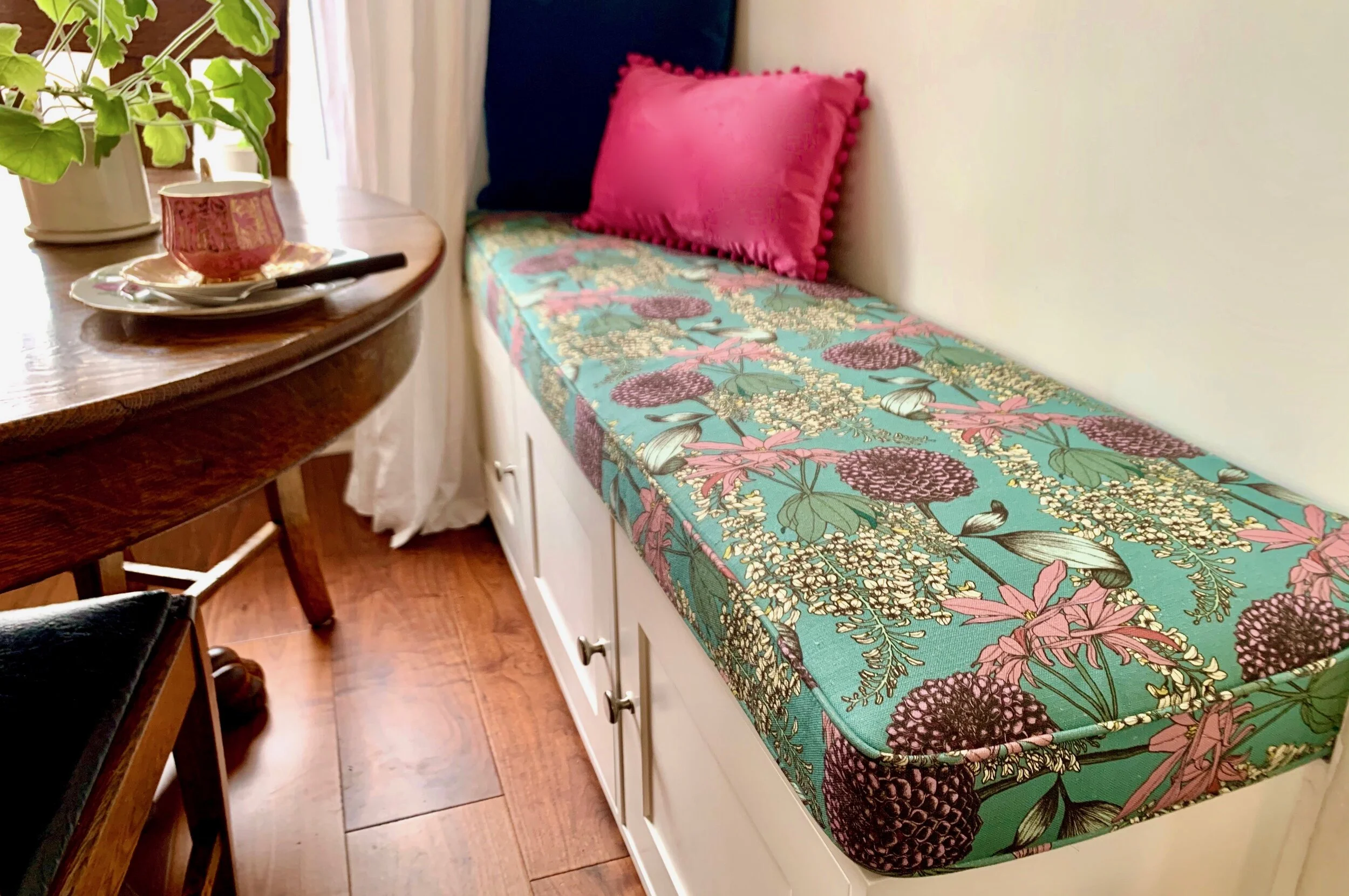 A basic white bench seat become a perfect teatime nook with an upholstered cushion by Double R Design in a beautiful upholstery fabric by Abigail Borg.