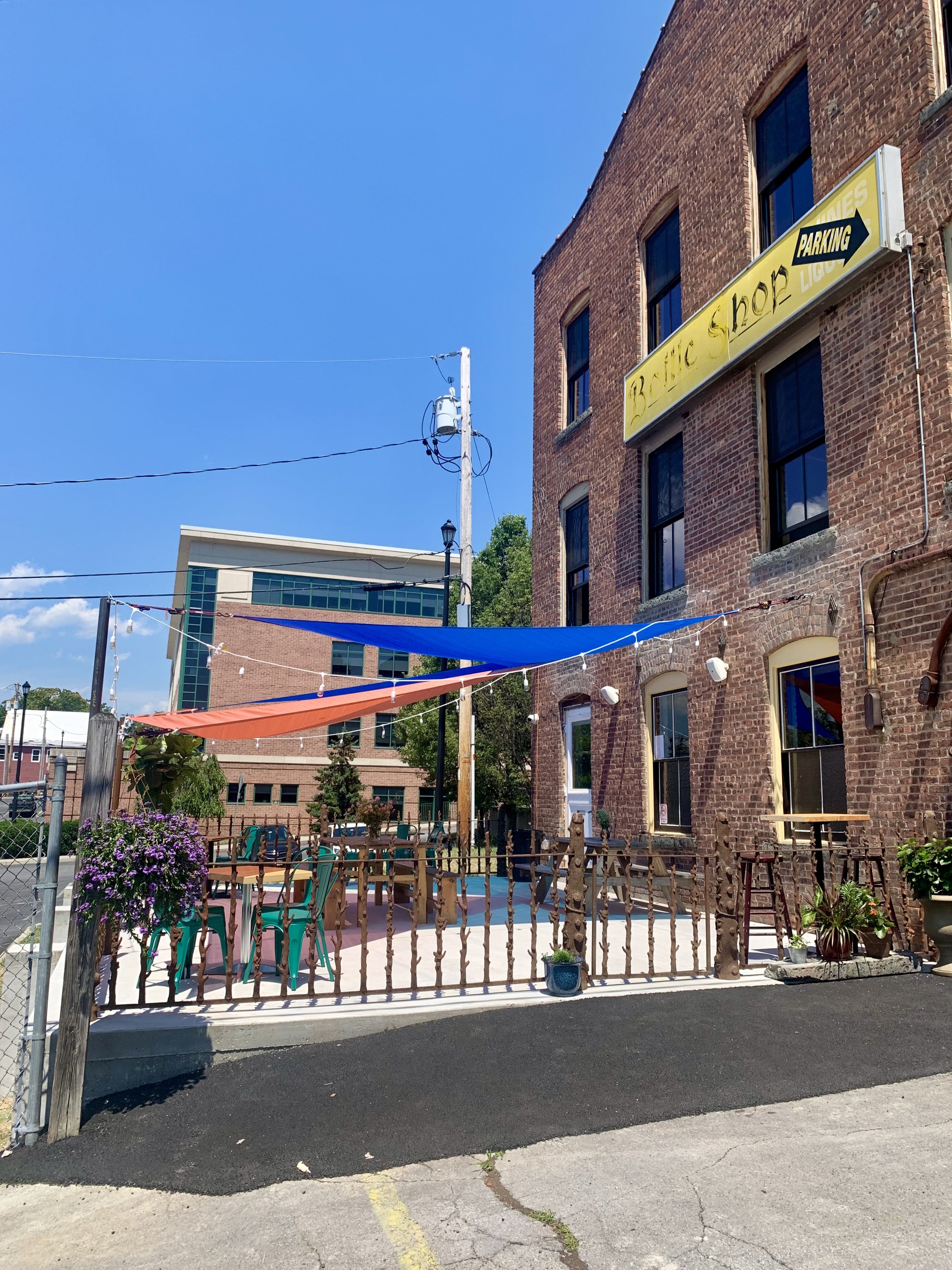 The outdoor seating at Left Bank Cider is more kid-friendly than the indoor bar area. There are canopies for shade and string lights to add an evening glow.