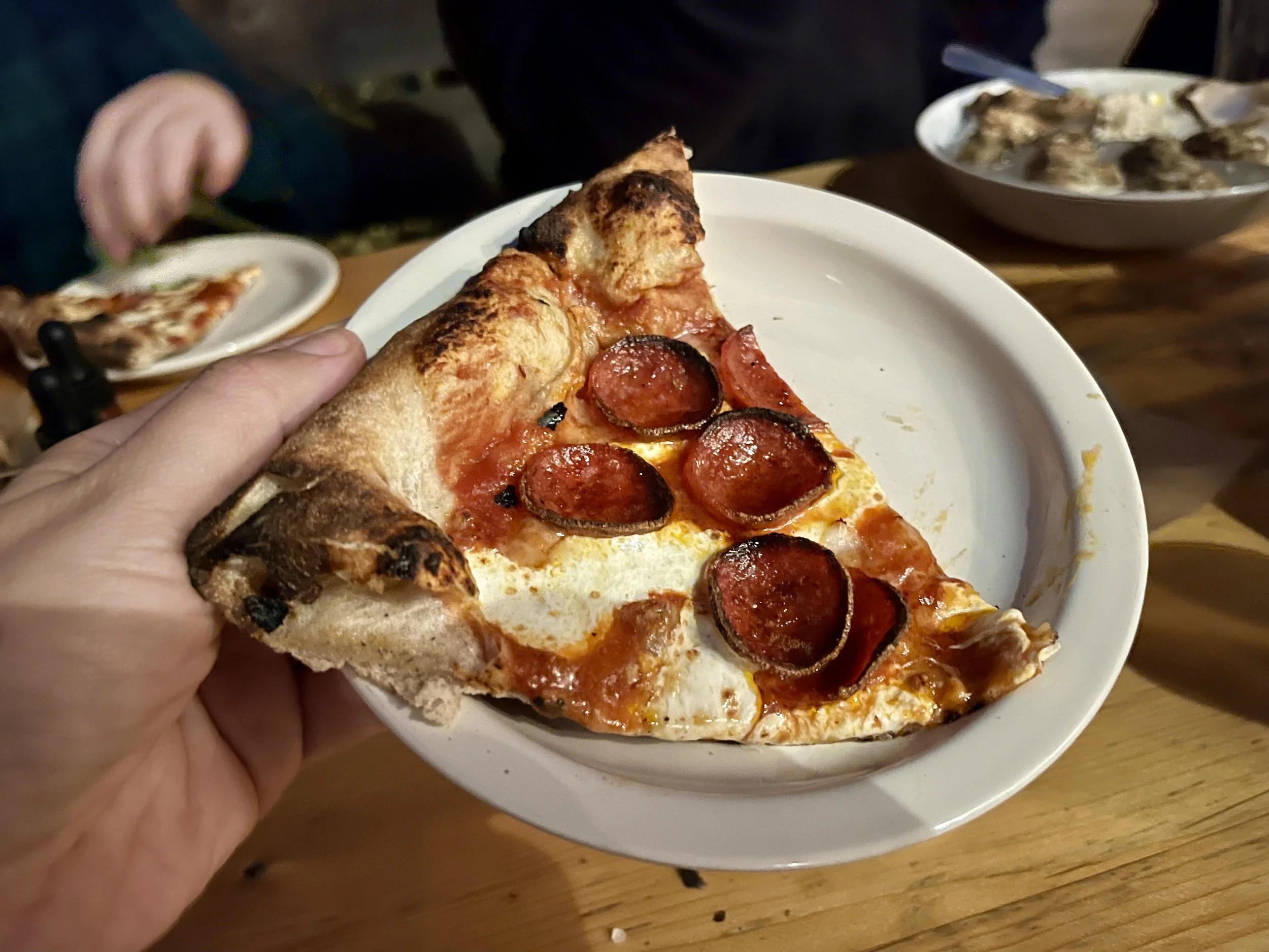 The pepperoni pizza featured a generous layering of curled-edge ‘roni cups, creamy mozzarella, and tangy crushed tomatoes on a sourdough crust with just the right amount of char and chew.