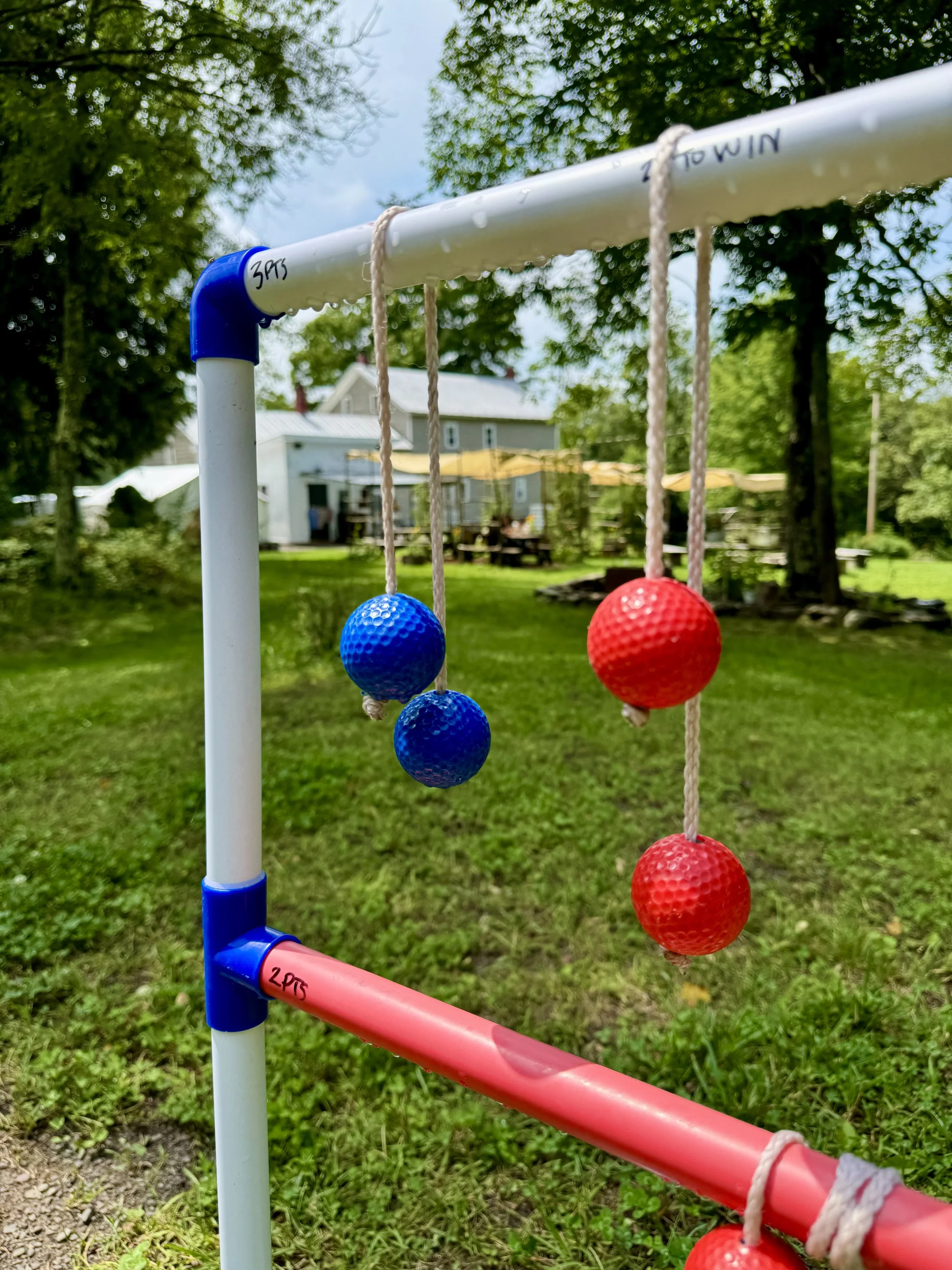 Once you get to its parking lot (parking field?) you must follow the path cut through some tall grass and wildflowers, over the trickle of a tiny creek, past a verdant garden, and toward the overflowing raised flowerbeds and the canvas canopies affixed to tall branches that are covered in trumpet vines. You'll find a stone fire pit, a fully enclosed glamping tent for cold or rainy days, colorful lawn games, and perhaps some vibey Latin jazz piped through unseen speakers.